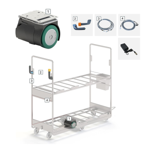 Der BLDC PM-Motor mit einer Nennleistung von 170 W ist in ein stoßfestes Gehäuse aus Gusseisen integriert. Pro Rad können Lasten von 1 Tonne mühelos und sicher bewegt werden.